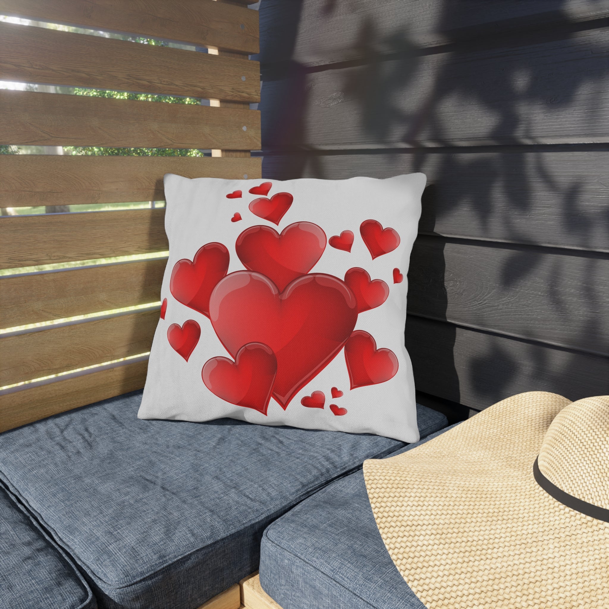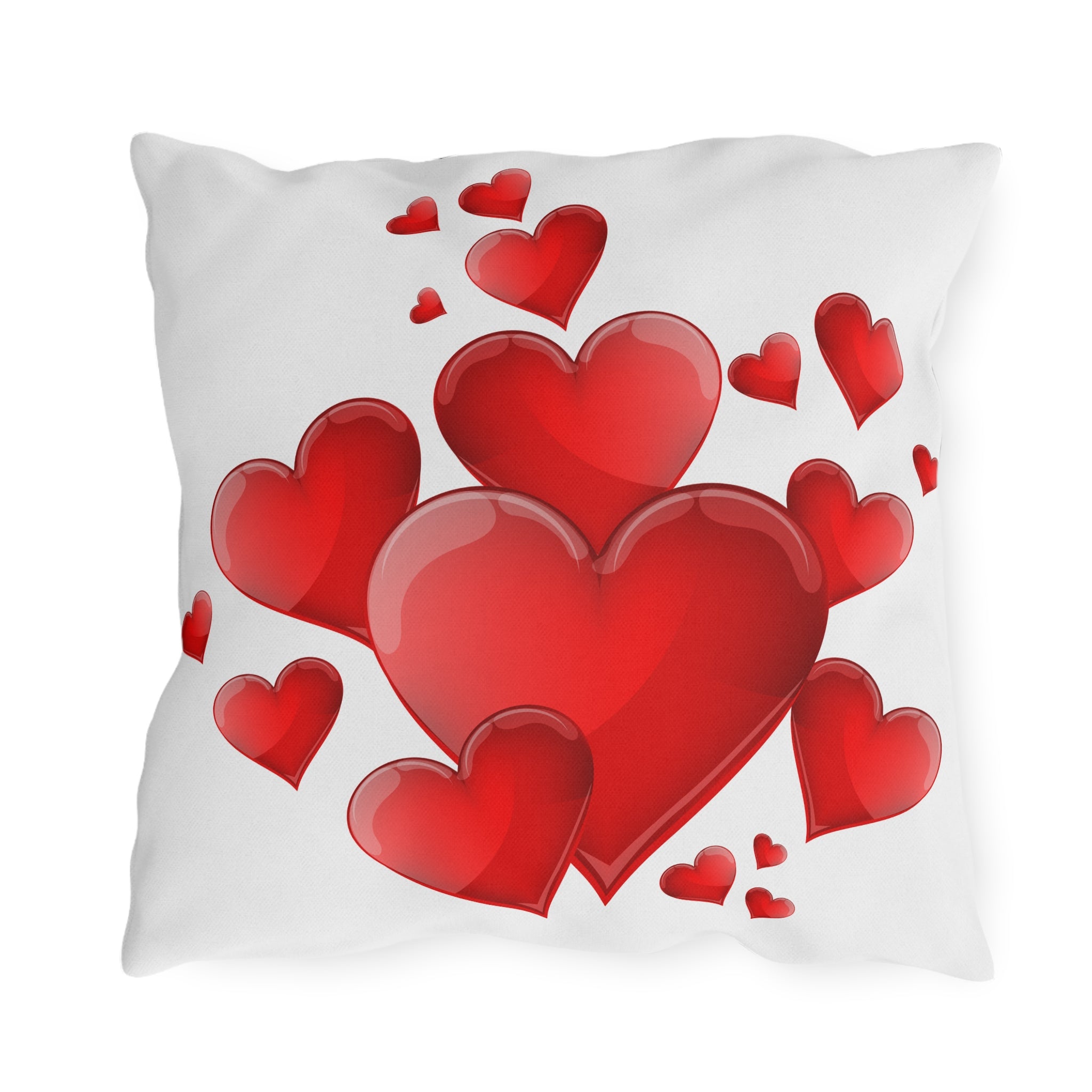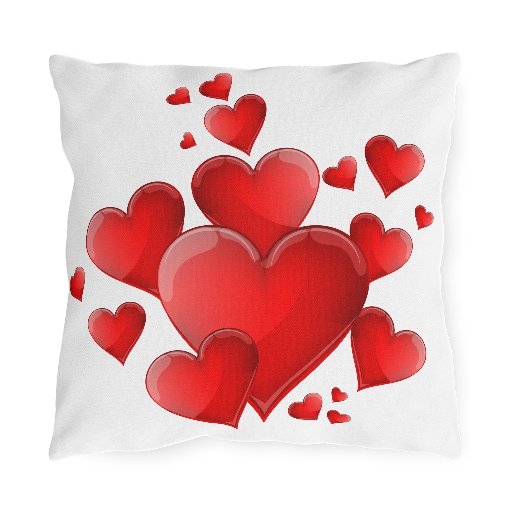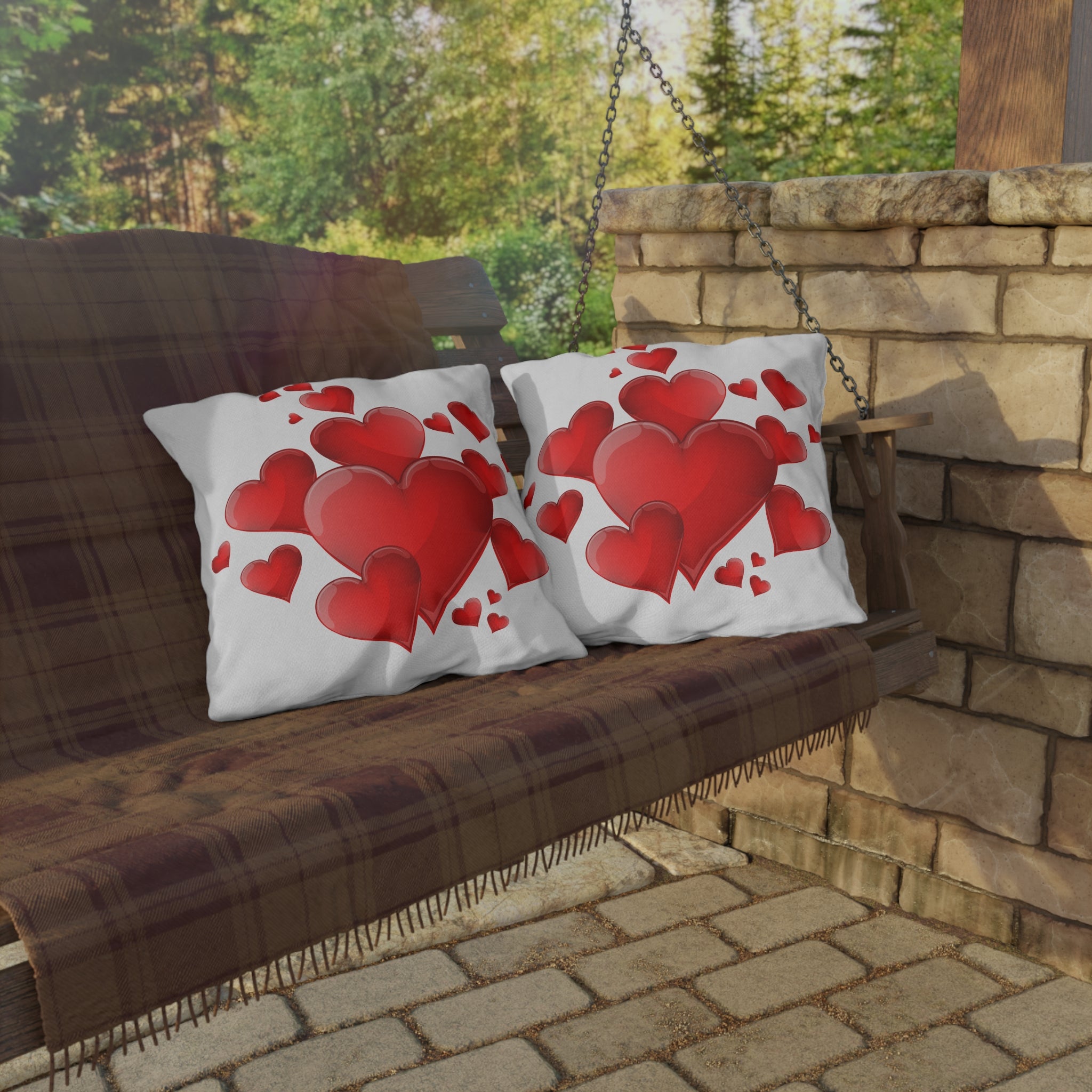Bright, heart-filled outdoor pillow that brings a playful, romantic accent to patios, porches, and cozy outdoor nooks. The double-sided design shows layered glossy red hearts that pop against a clean white background. Made from spun polyester with direct-to-fabric printing and UV/water-resistant finishes, this pillow stays vibrant through sun and light rain while holding its shape and resisting wrinkles. It adds a joyful, loving touch to afternoon coffee on the deck, a sunset on the balcony, or a backyard gathering when you want color and comfort that lasts.