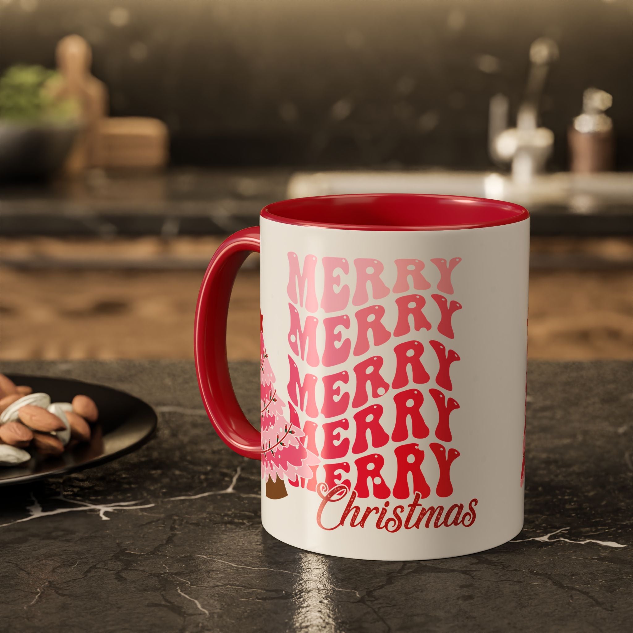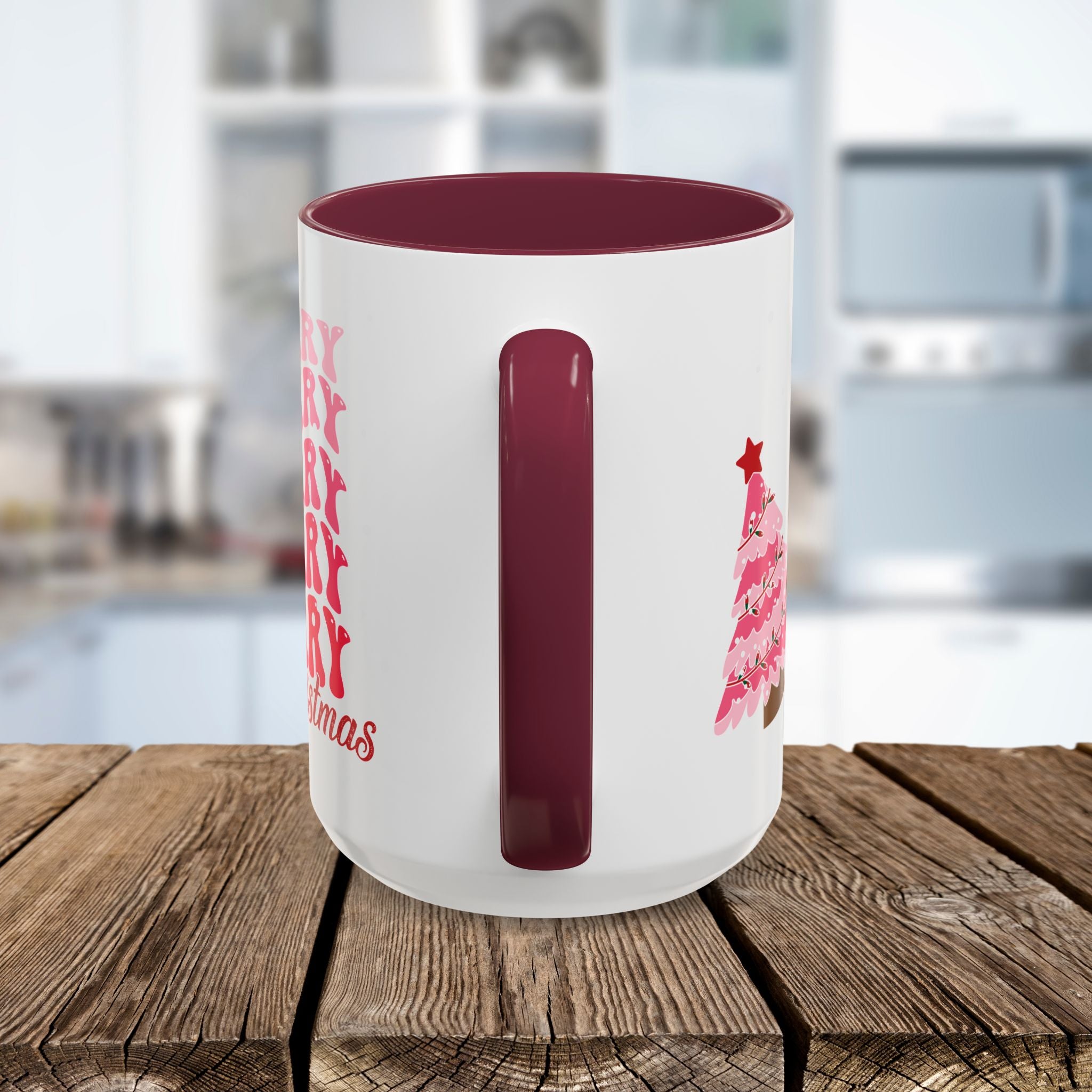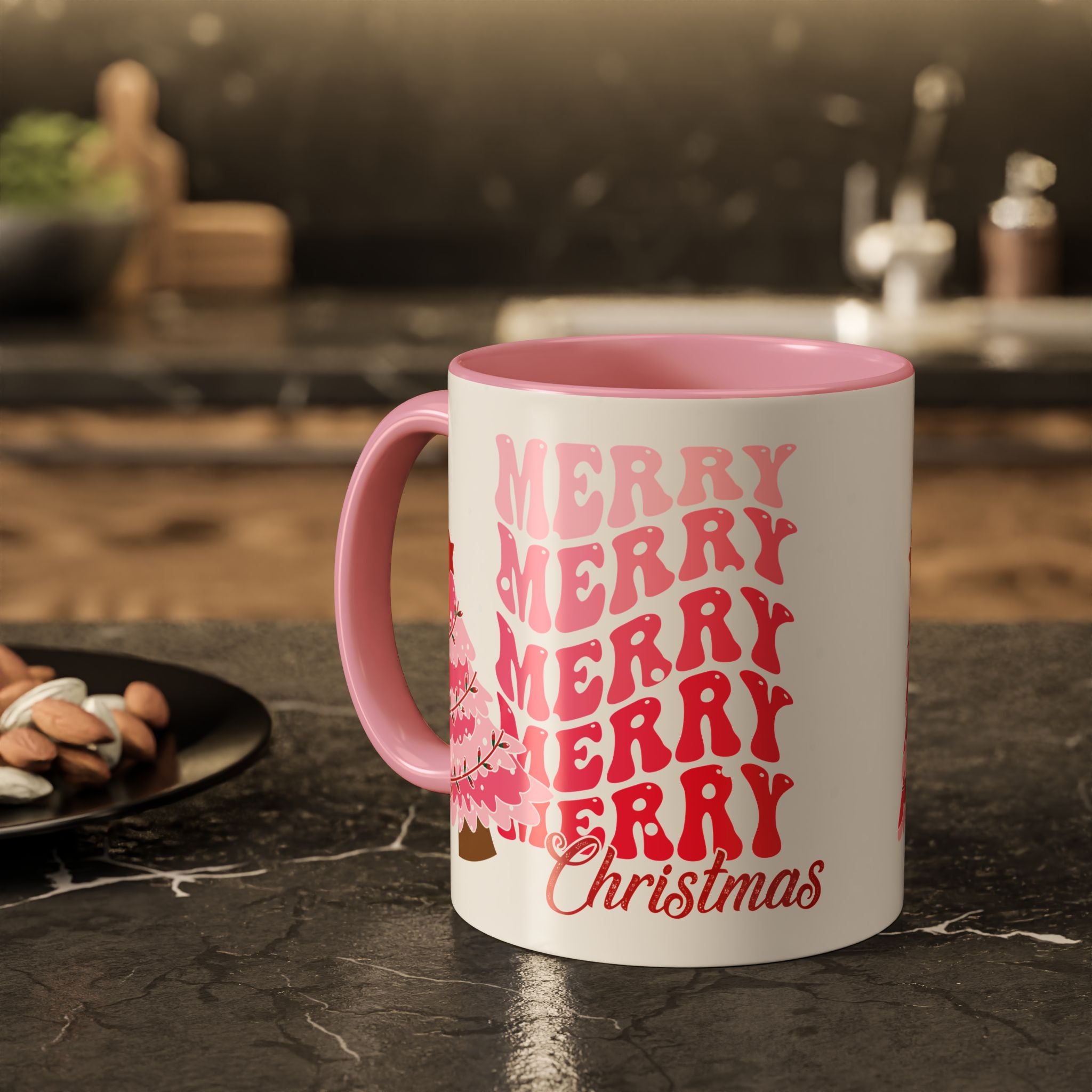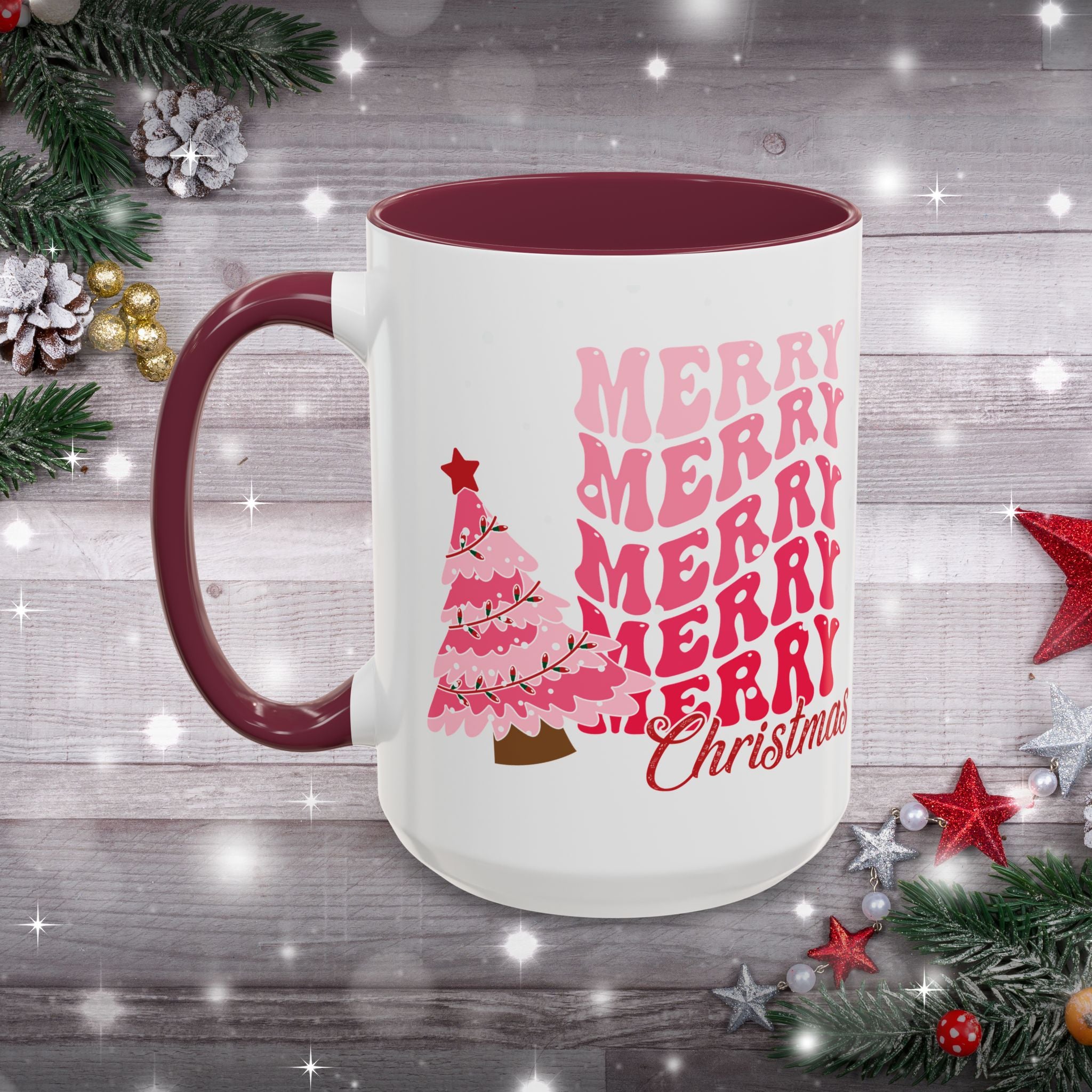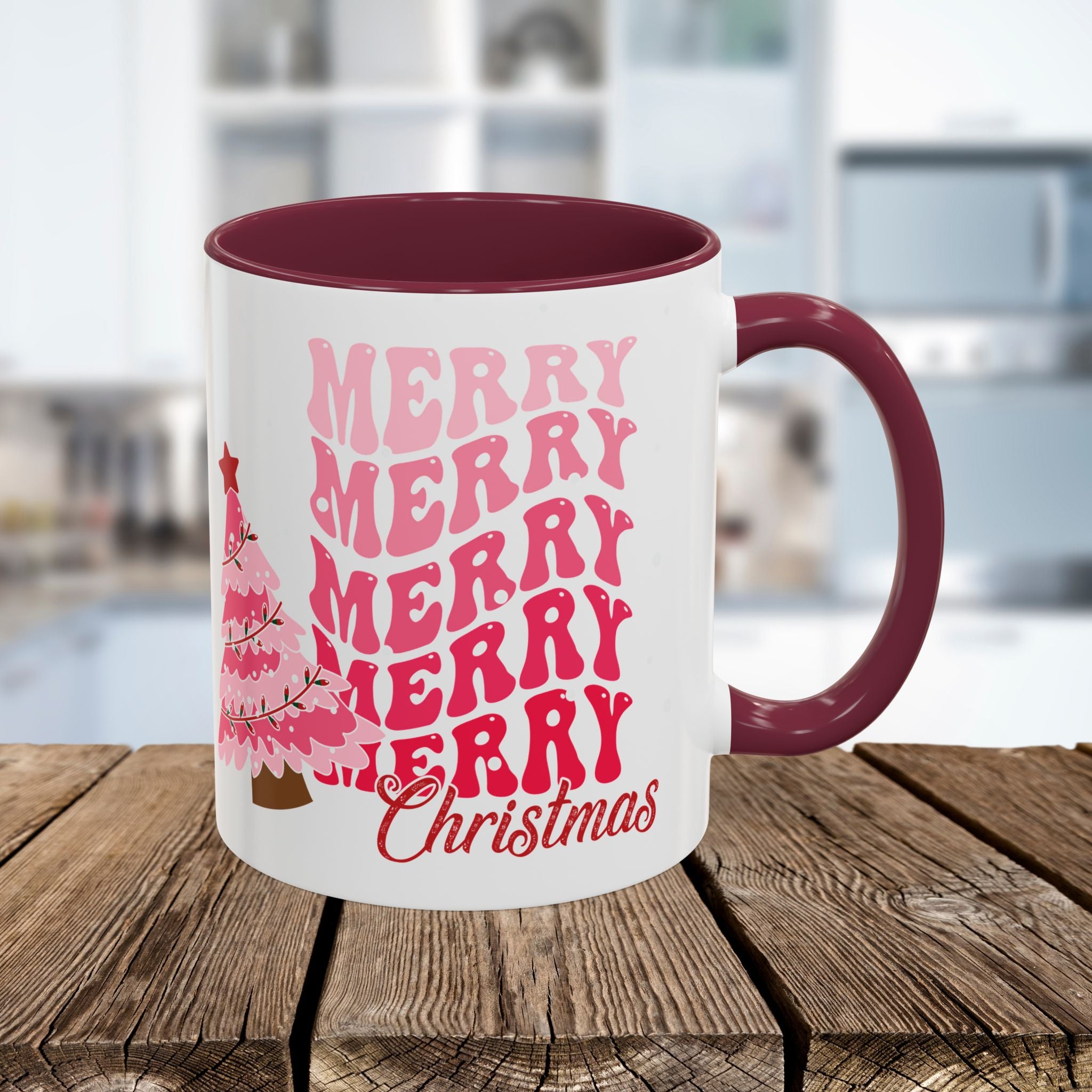 Enjoy the holidays with this beautiful pink Merry Merry Merry Christmas mug. It comes in two sizes 11 oz and 15 oz. Both with a ceramic colorful handle in either Red, Maroon or Pink, You Choose. They are dish washer safe and microwave safe. They make great gifts and stocking stuffers too. Pick one up for yourself and you will love sipping your favorite beverage out of it this holiday season.