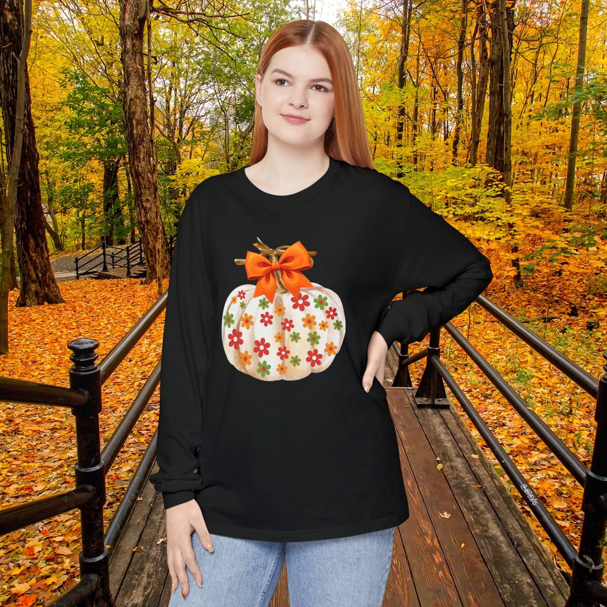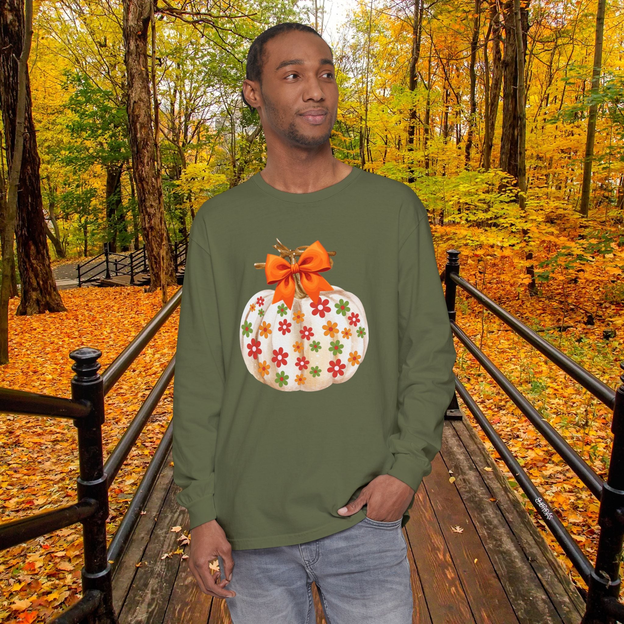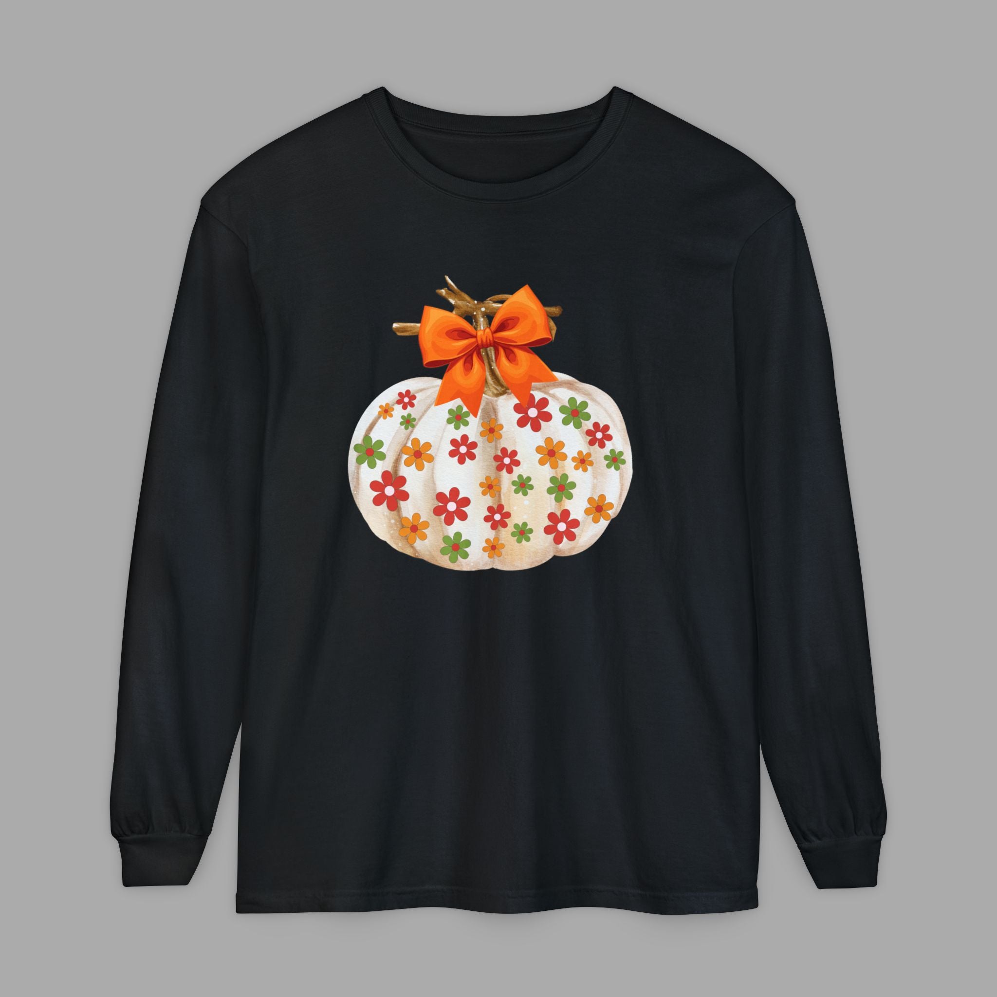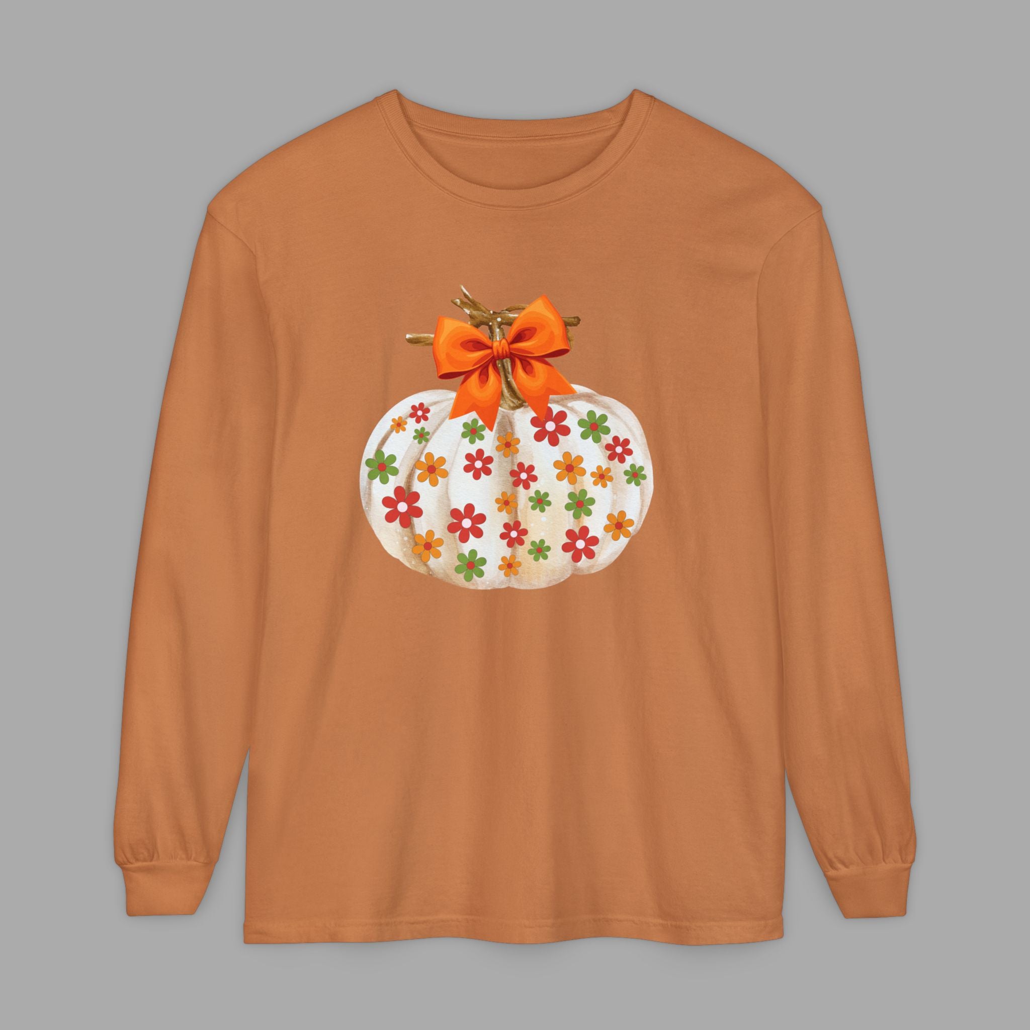 This cozy unisex long sleeve t-shirt is the perfect blend of comfort and style. Featuring a charming pumpkin design adorned with colorful flowers and a festive bow, it radiates a warm, autumn vibe. Ideal for casual outings, cozy evenings at home, or festive gatherings, this shirt complements your fall wardrobe seamlessly. It’s perfect for anyone who loves to celebrate the changing seasons or enjoys a touch of whimsy in their attire. Great for Halloween parties, Thanksgiving celebrations, or simply enjoying the crisp fall air, this shirt is a delightful addition to any wardrobe.