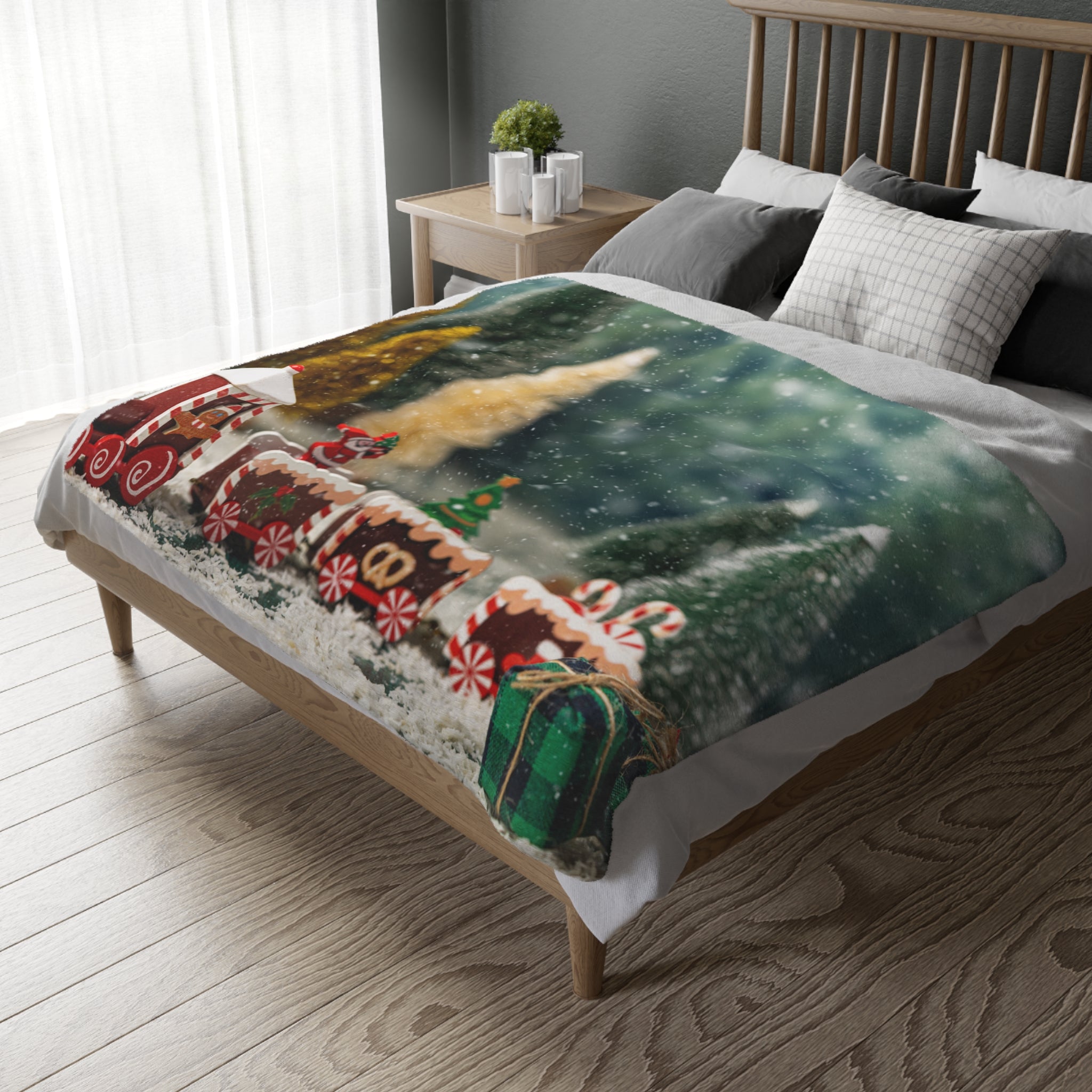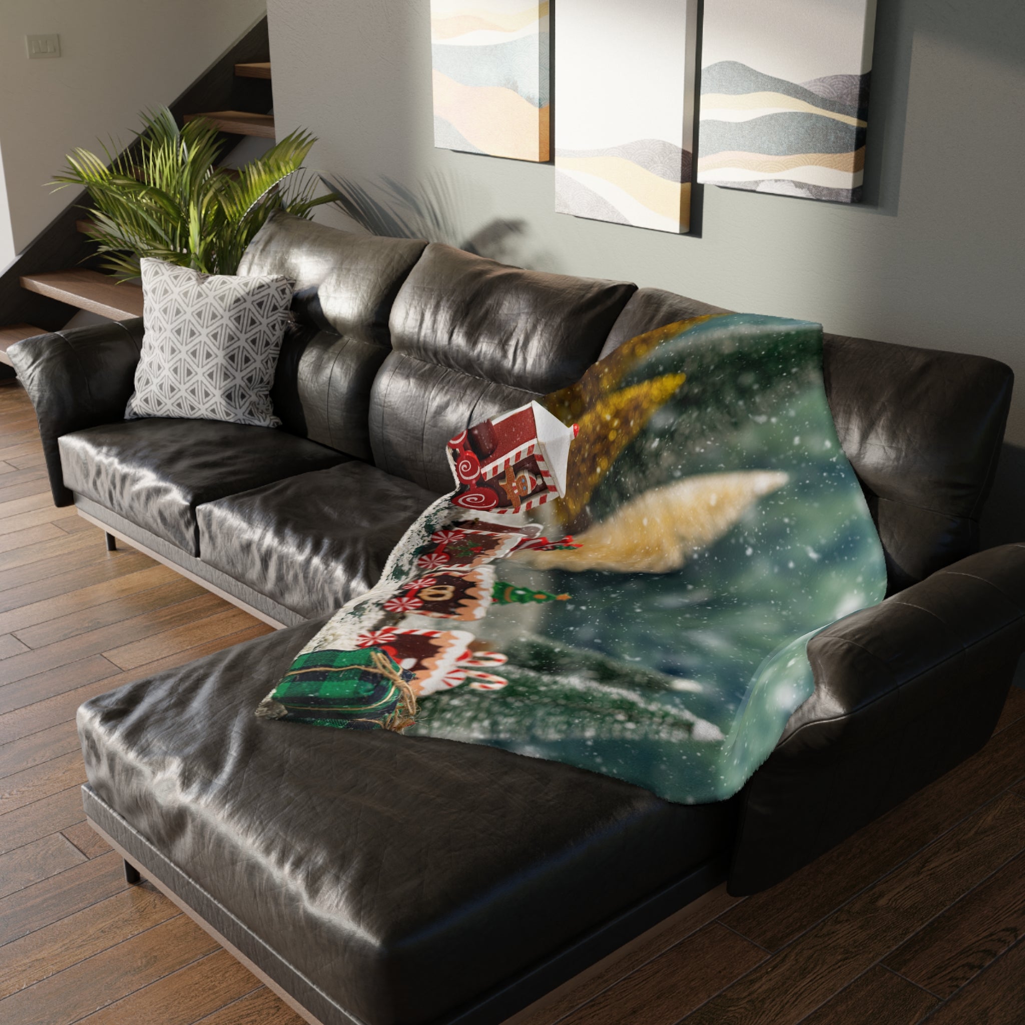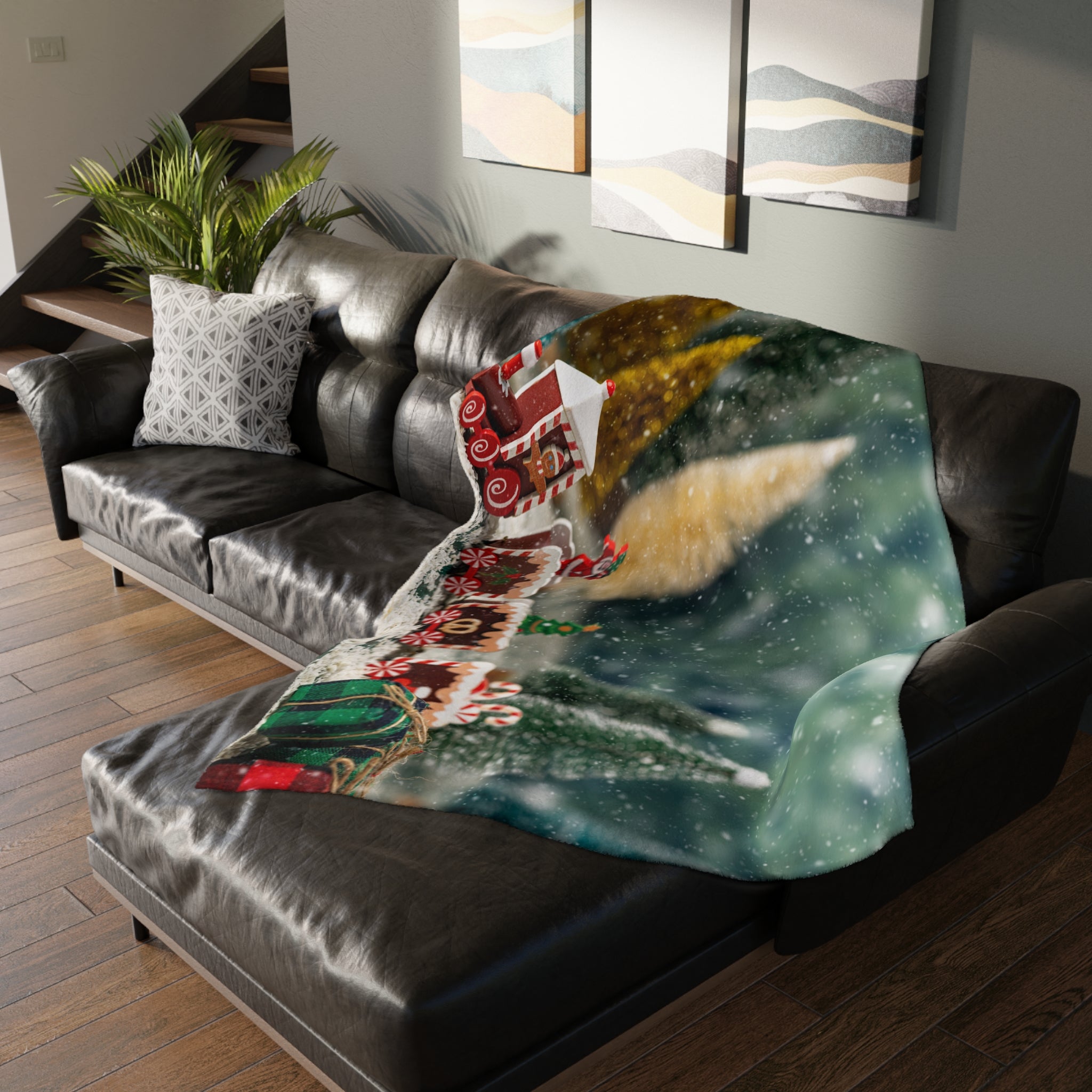 Wrap yourself in a warm, whimsical scene of holiday sweetness. This velveteen microfiber blanket feels plush against your skin and carries a sharp, two-sided print of tiny gingerbread houses, candy canes and snowy fir trees dusted in soft falling snow. It invites quiet evenings on the couch with a mug, low lights, and seasonal playlists — or becomes a cozy layer during movie nights and winter travel. The stitched hem keeps the shape through wash and use, while the vivid printing preserves the festive colors that bring a touch of childhood wonder to any room.