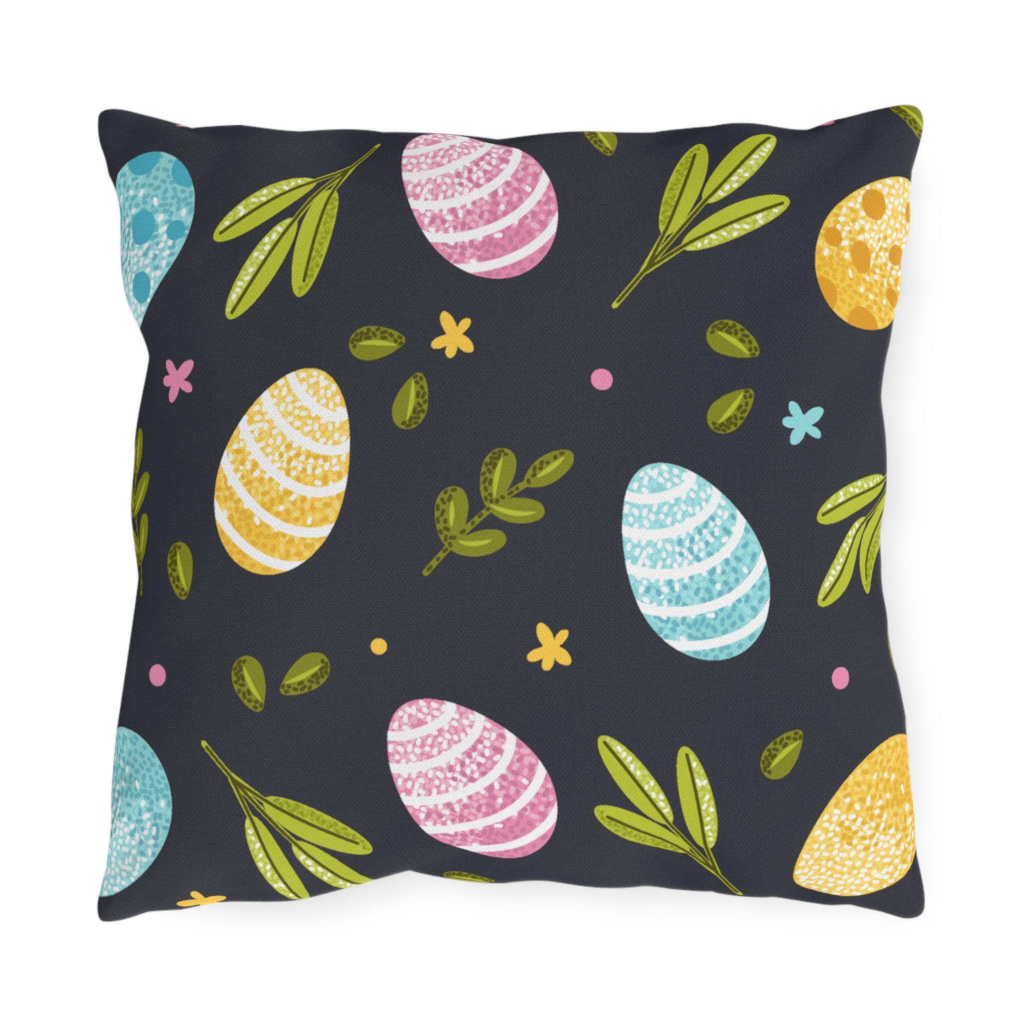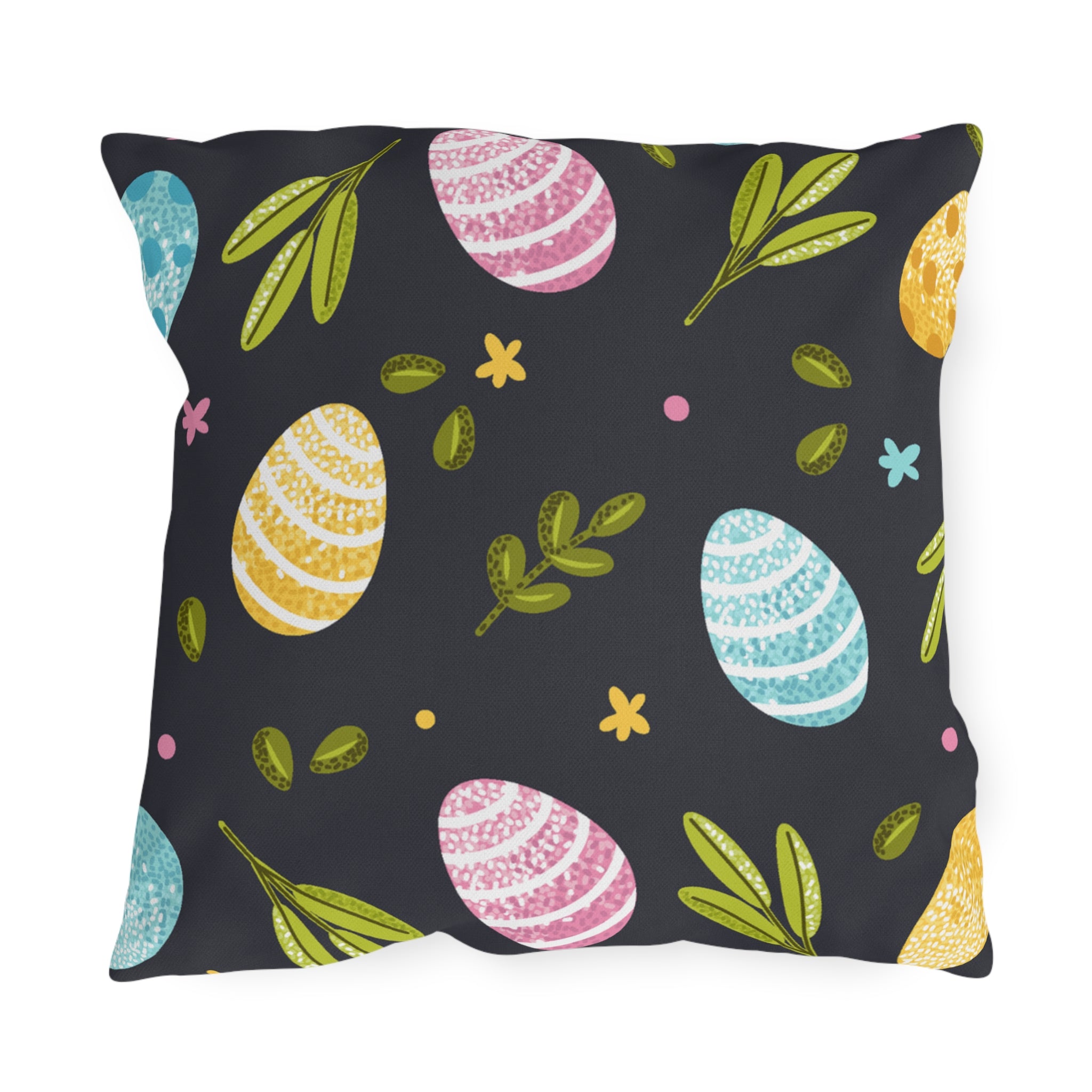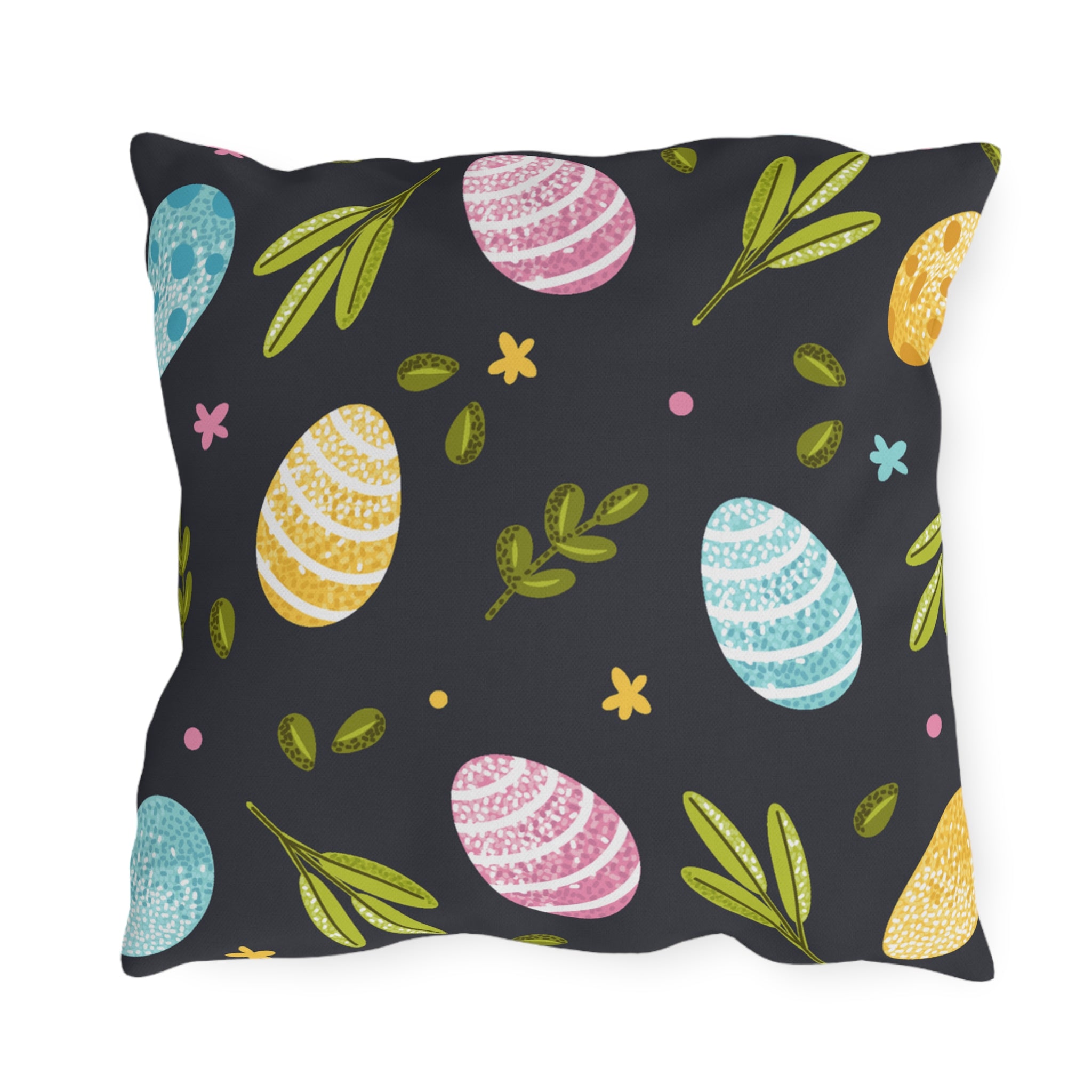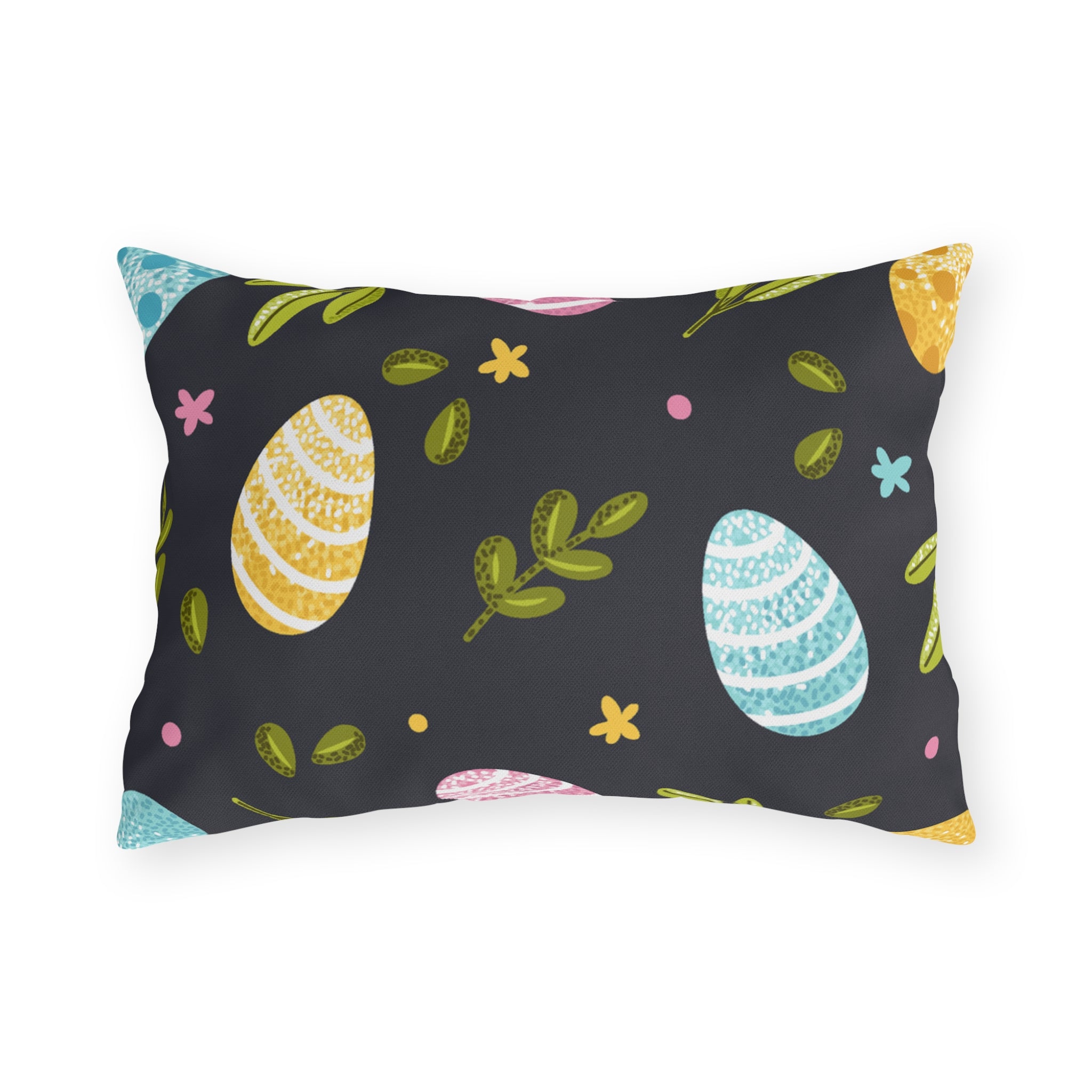 Easter Egg Pattern Outdoor Pillow — Pastel Eggs & Greens on Dark