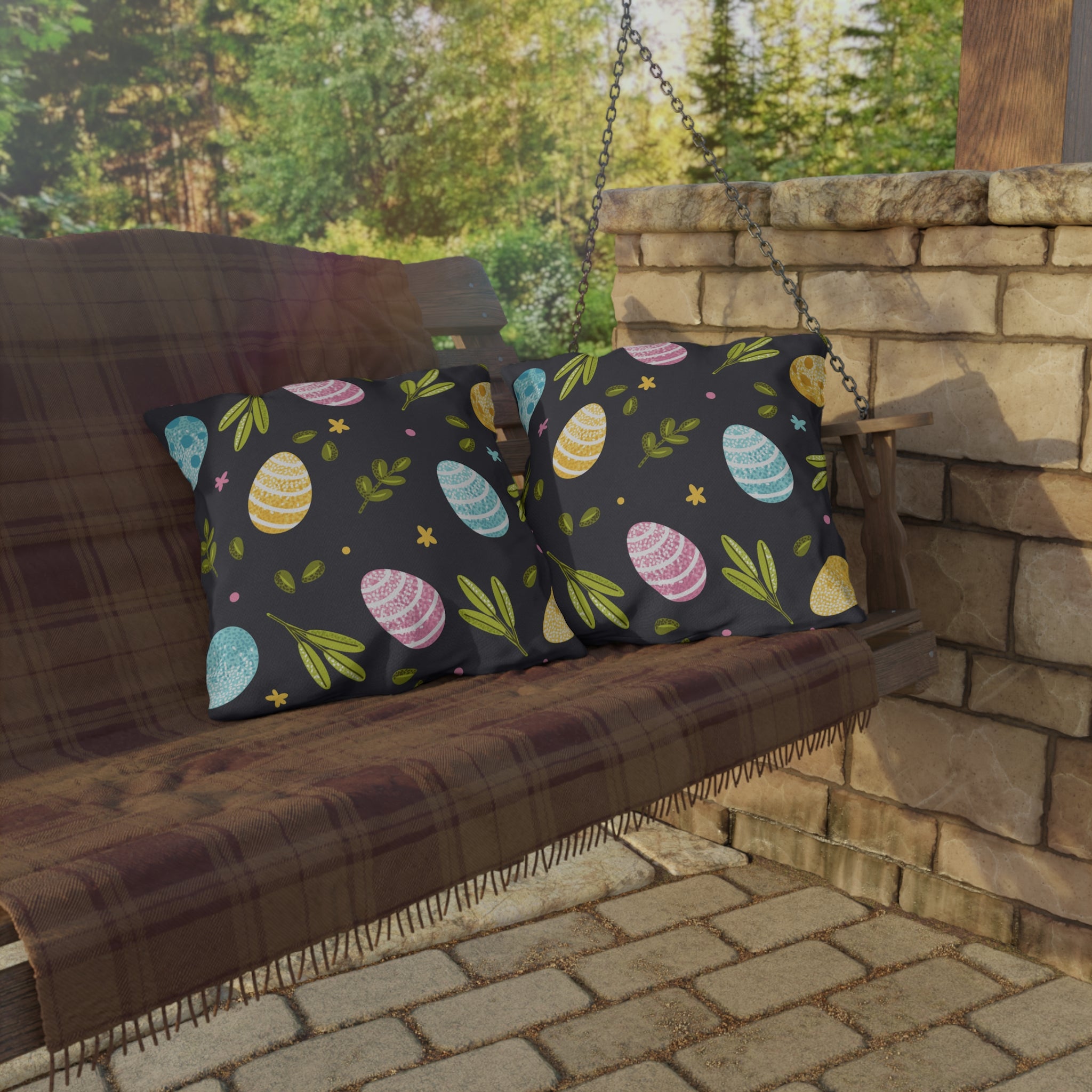 Bring a playful, hand-drawn touch to your porch, patio, or cozy reading nook with these outdoor pillows. The design pairs softly textured Easter-style eggs and leafy sprigs against a deep charcoal background, lending a lively, slightly whimsical vibe without feeling juvenile. Tuck one into a woven chair, layer a few on a bench, or use them to brighten an outdoor table seat — they hold their shape and color through sun and occasional splashes, so they keep looking like part of the set rather than an afterthought. The double-sided print and crisp colorwork give the pattern depth from every angle, while the sturdy fill makes them comfortable to lean into during slow morning coffee or an evening chat under string lights.