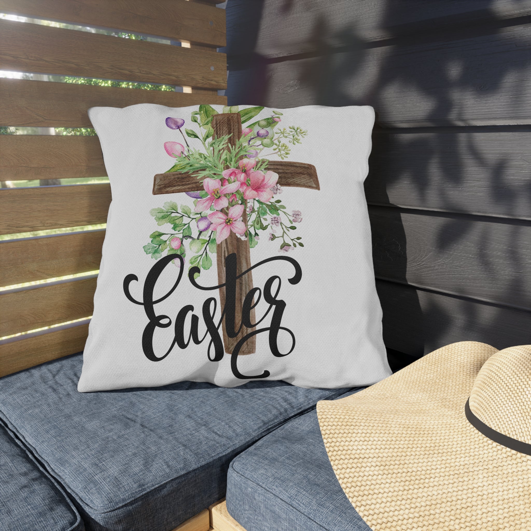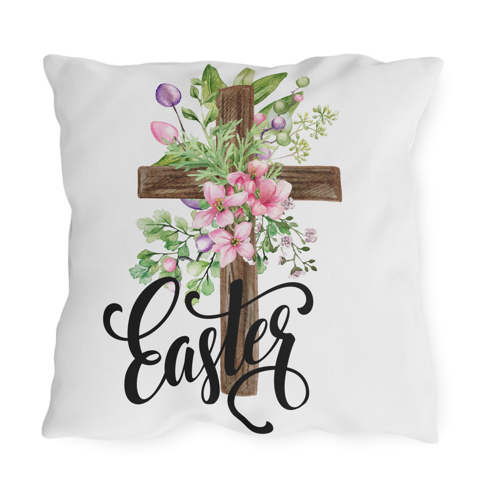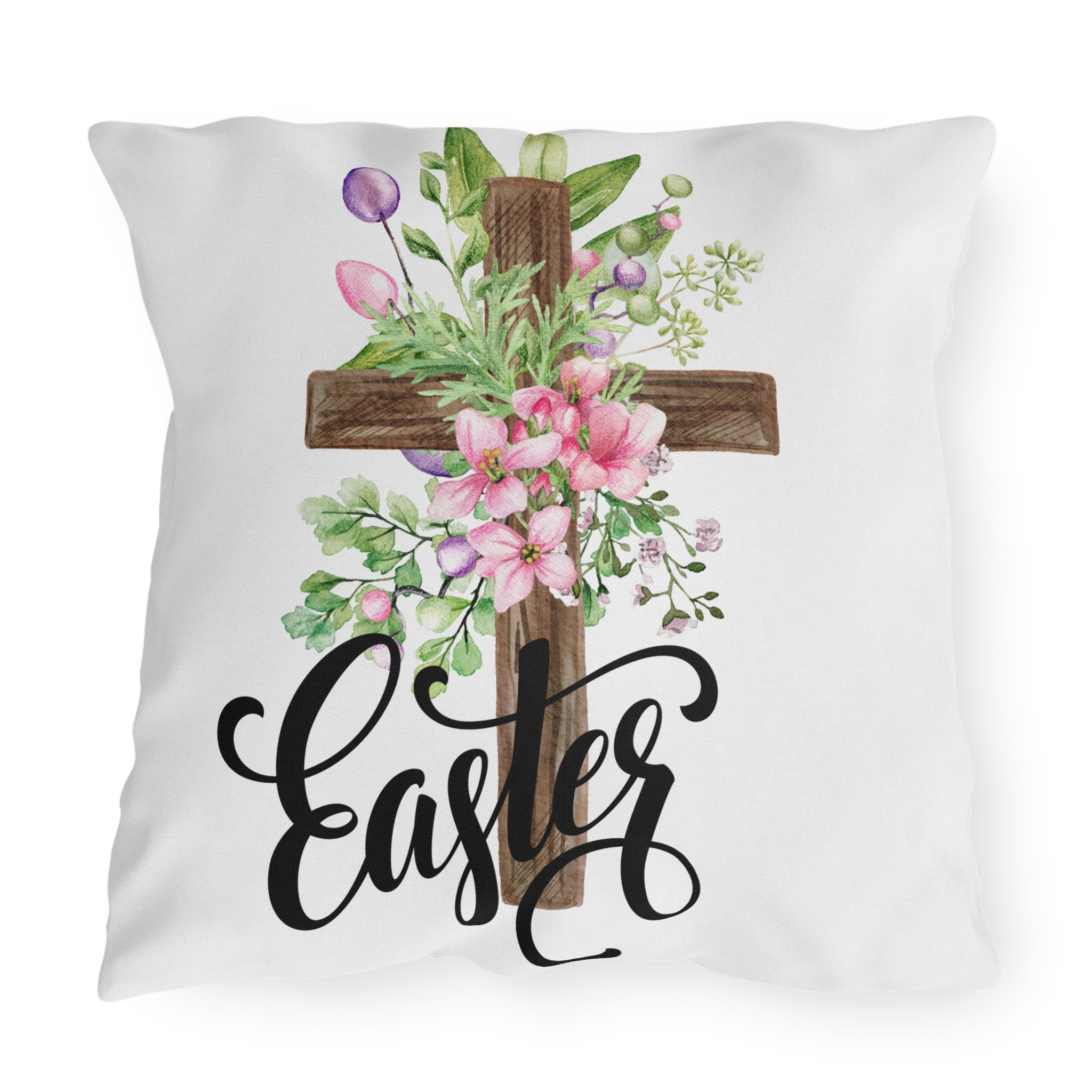 Soft, floral, and quietly reverent — this outdoor pillow brings an Easter morning to your porch or garden. A rustic wooden cross is wrapped in watercolor blooms and spring greenery, while hand-lettered “Easter” flows beneath in elegant script. The breathable spun polyester face holds vibrant, double-sided color through sun and shower. Plump, supportive filling keeps the cushion cozy for Sunday services on the patio, backyard brunches, or simply slowing down with a warm drink while blossoms open. It feels like a gentle nod to faith and the new season, placed where friends and family gather.