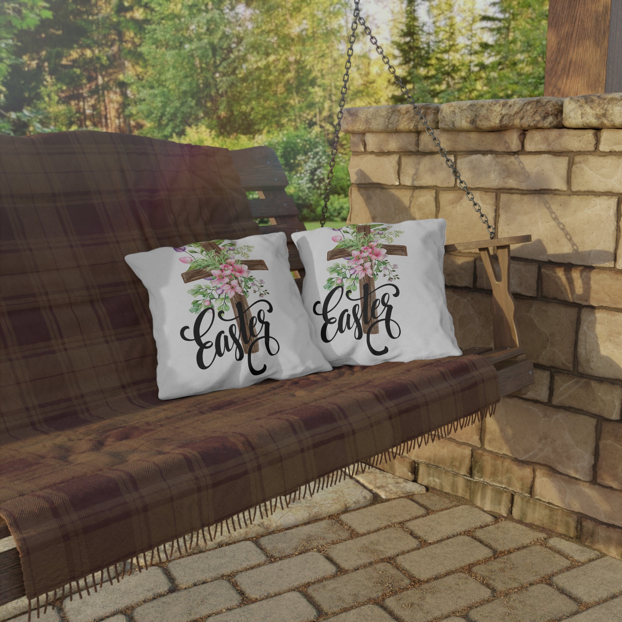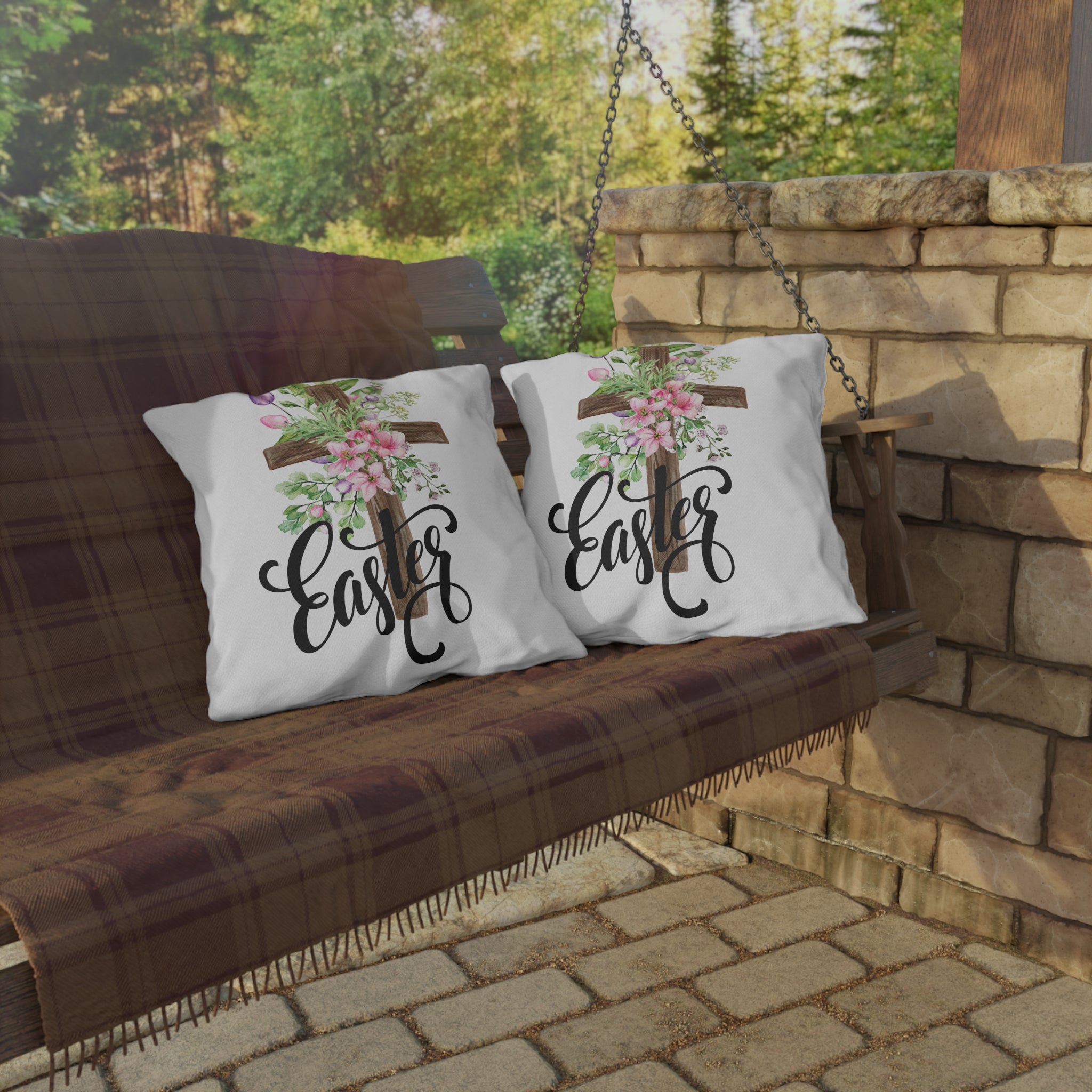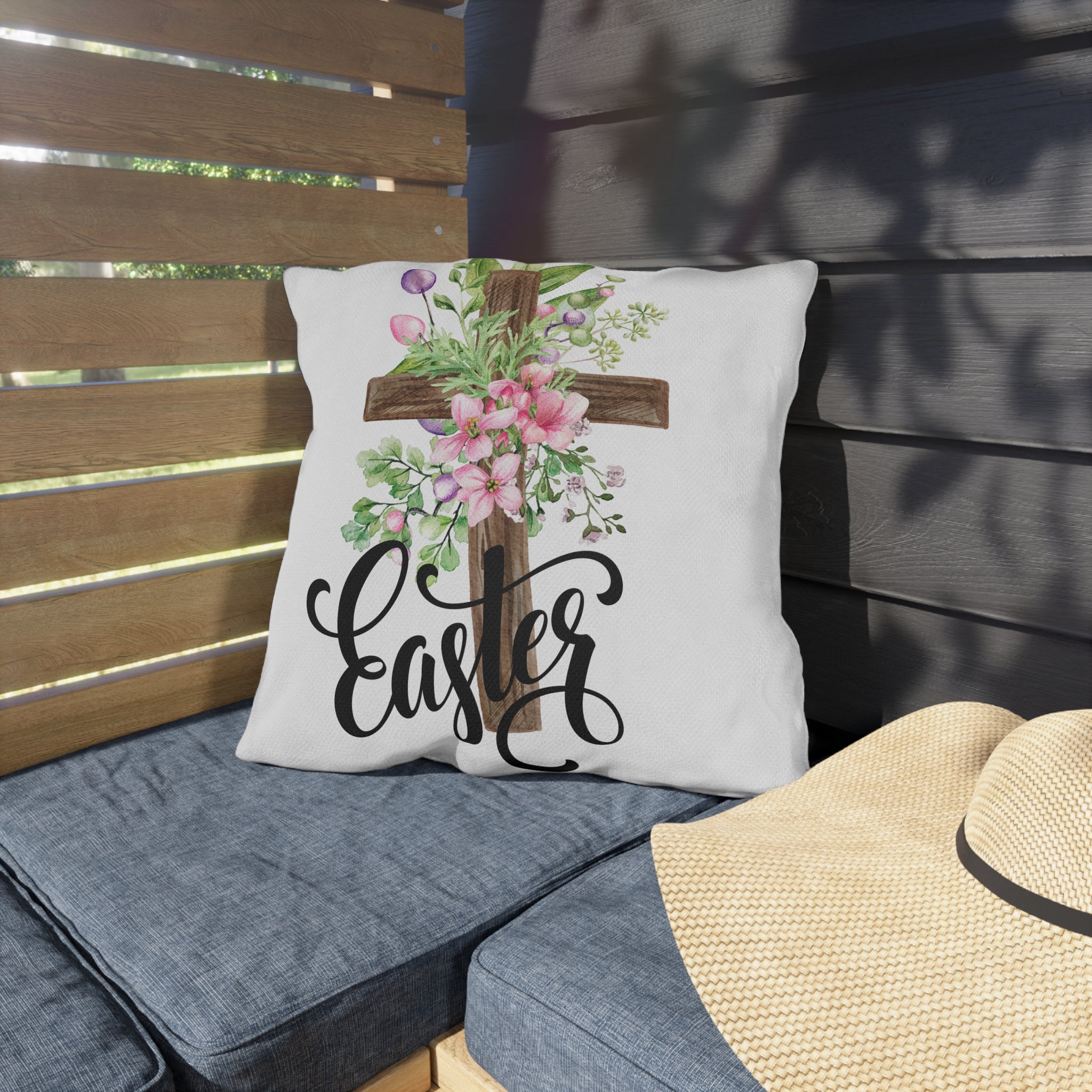 Soft, floral, and quietly reverent — this outdoor pillow brings an Easter morning to your porch or garden. A rustic wooden cross is wrapped in watercolor blooms and spring greenery, while hand-lettered “Easter” flows beneath in elegant script. The breathable spun polyester face holds vibrant, double-sided color through sun and shower. Plump, supportive filling keeps the cushion cozy for Sunday services on the patio, backyard brunches, or simply slowing down with a warm drink while blossoms open. It feels like a gentle nod to faith and the new season, placed where friends and family gather.