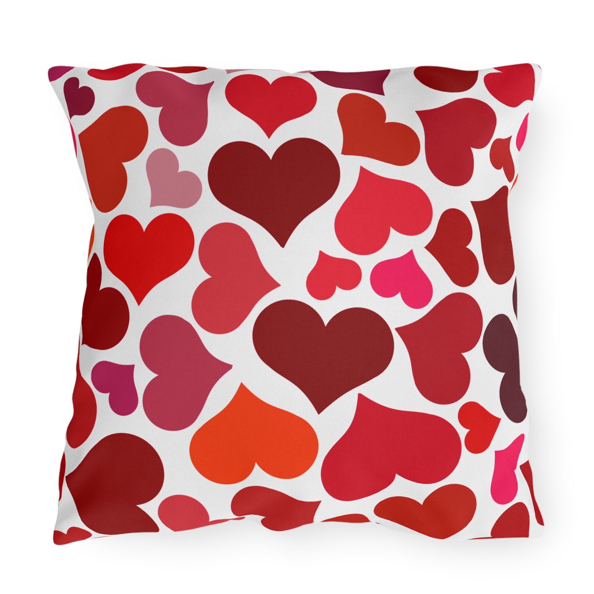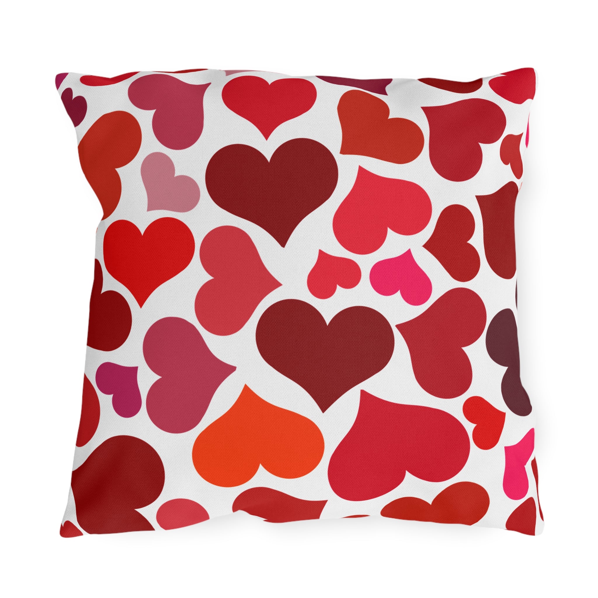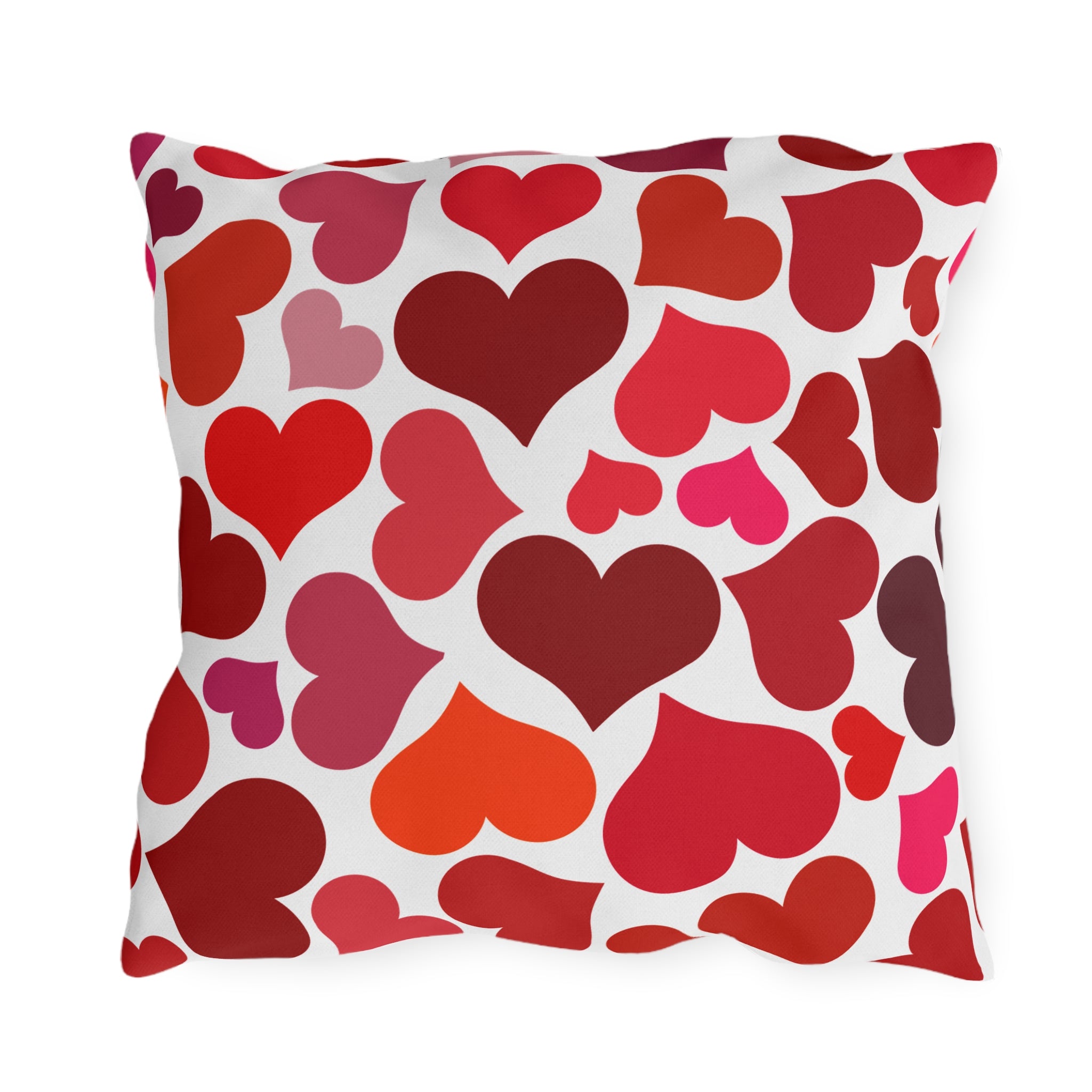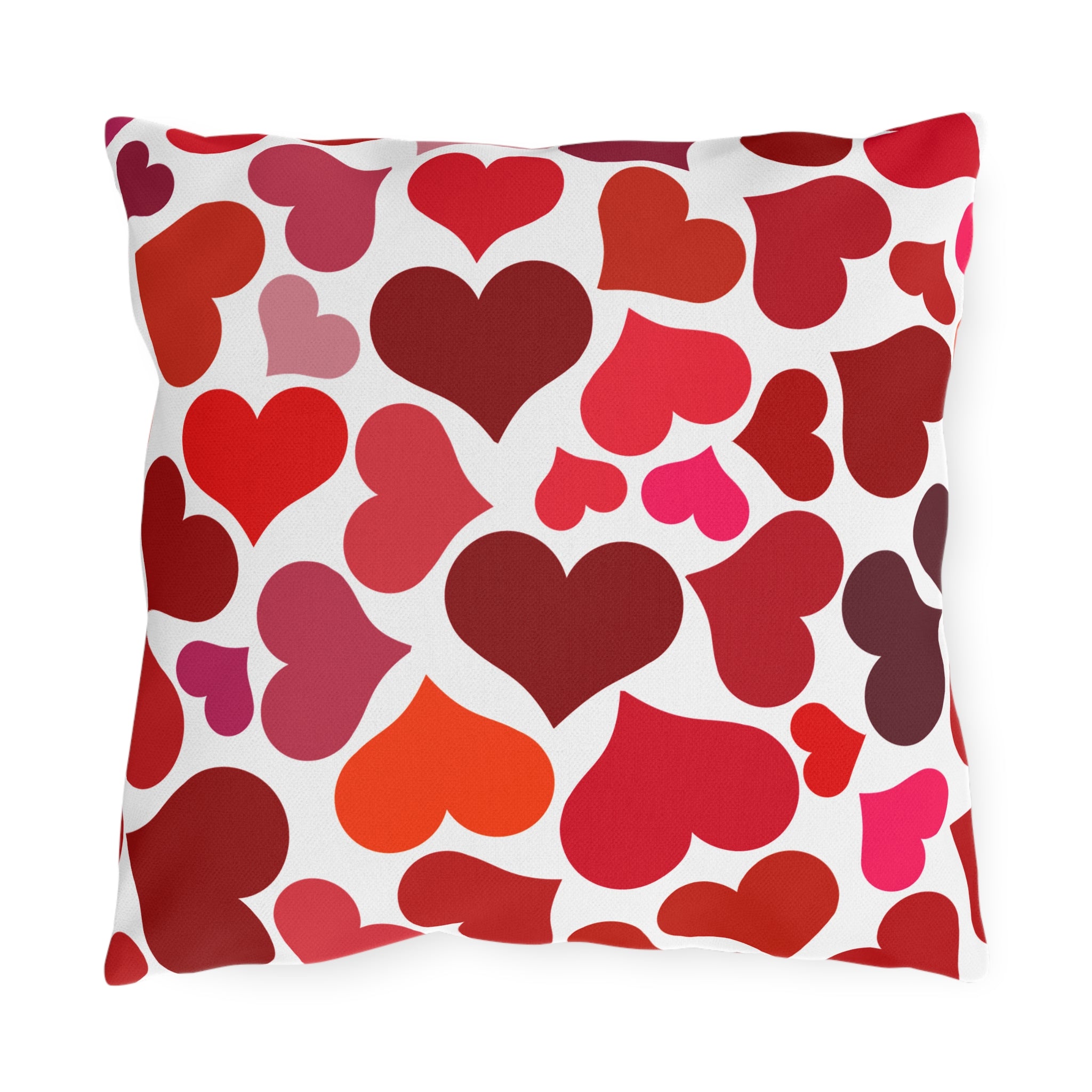 Bright, heart-covered outdoor pillows that bring playful warmth to porches, patios, and garden nooks. The double-sided print showcases a scattered pattern of hearts in rich reds, corals, and pinks against a clean white background — cheerful without being loud. Built to handle sun and light rain, the vibrant direct-to-fabric colors stay bold season after season while the sturdy spun-polyester weave keeps the shape and soft hand you’ll reach for when lounging. These pillows slide into relaxed outdoor living: a stack on a wicker chair, a pop of color on a bench, or a cozy addition to a backyard conversation spot during summer evenings and casual Valentine gatherings.