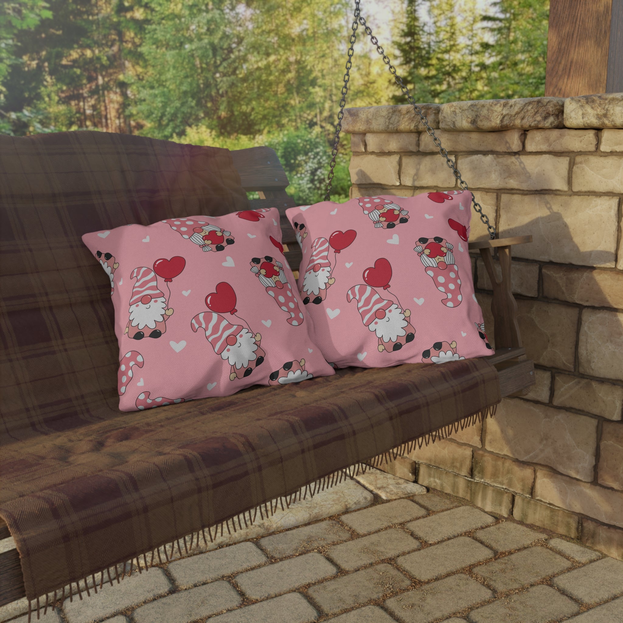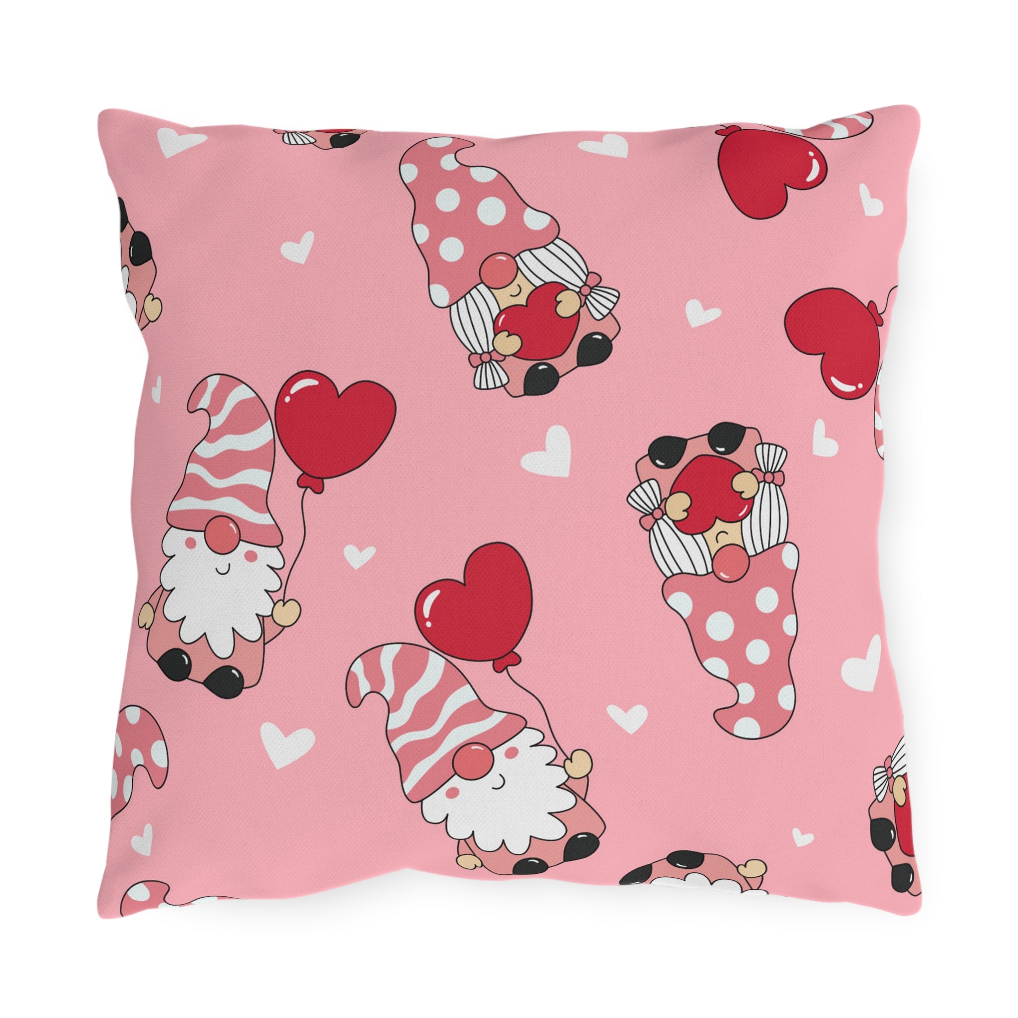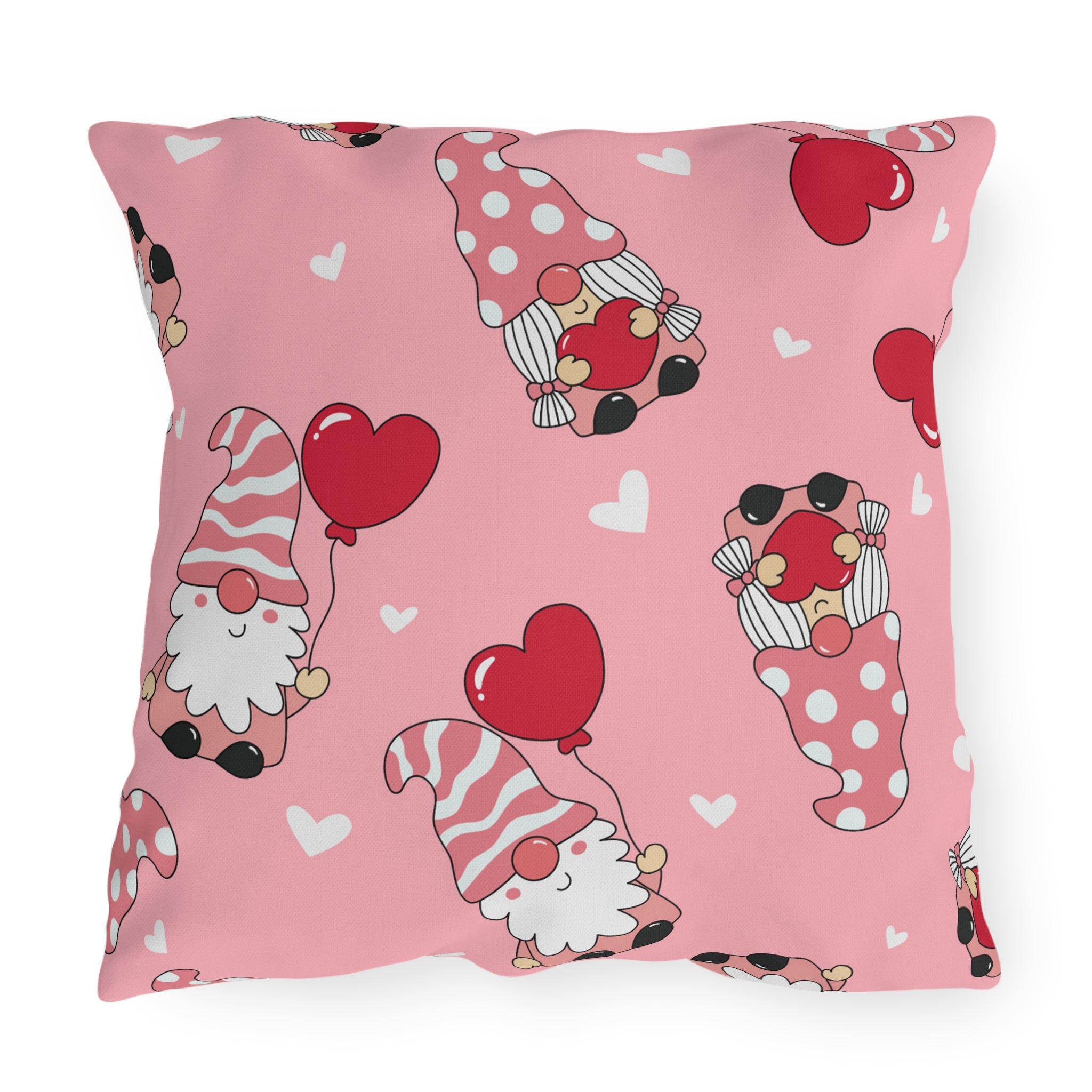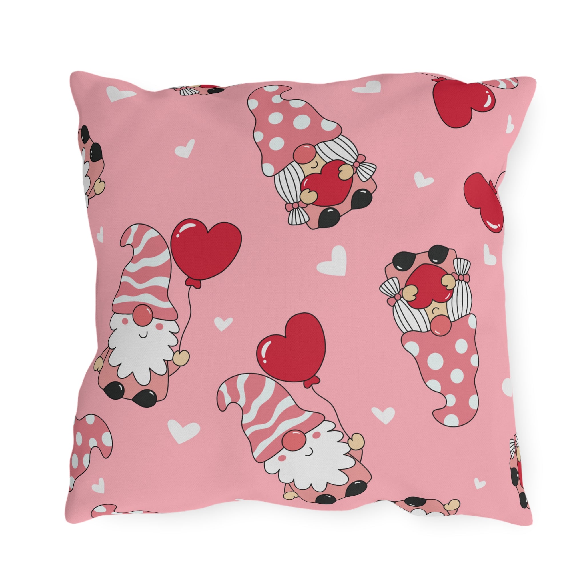 Valentine Gnome Outdoor Pillow — Pink Heart Pattern